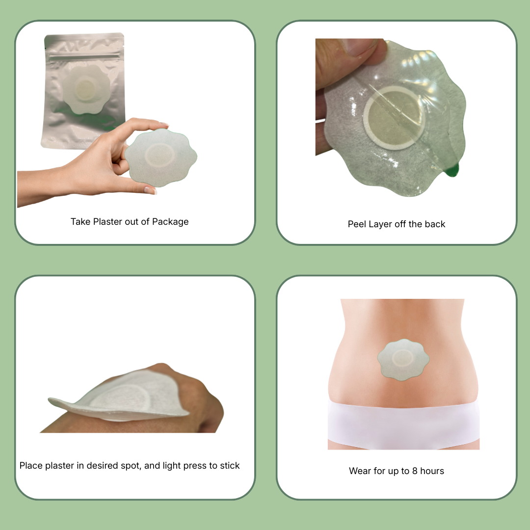 Designed to be worn comfortably on the body, including the abdomen or belly button area, these patches remove the need for cloth wraps, heating pads or loose oils.